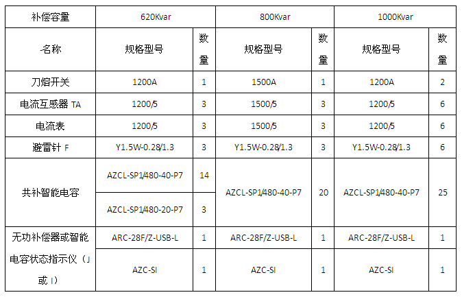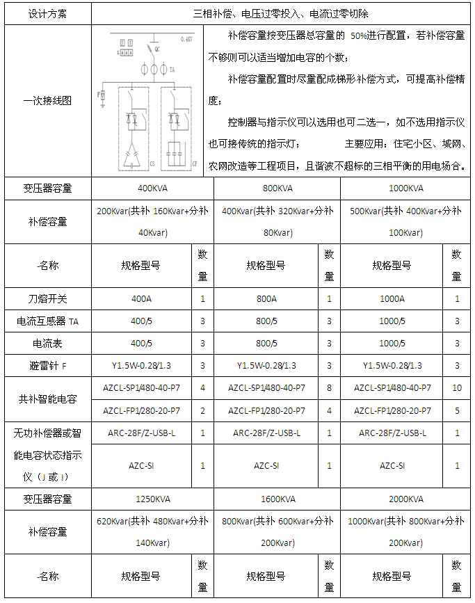 2、變壓器容量為400/800/1000/1250/1600/2000KVA的單相、三相混合補(bǔ)償應(yīng)用方案(串接7%電抗器)。