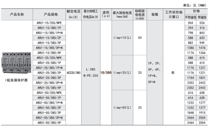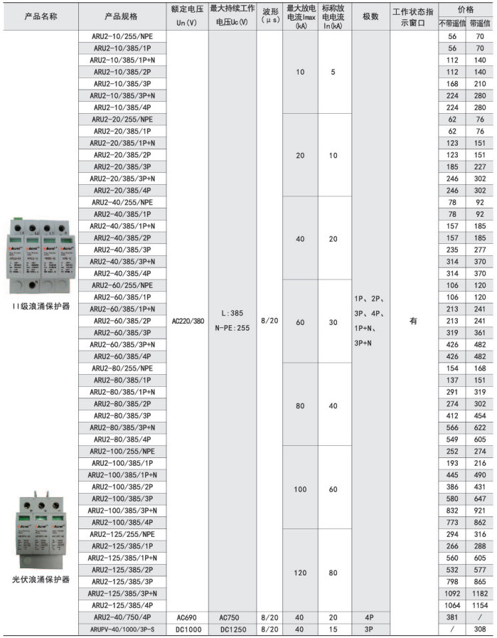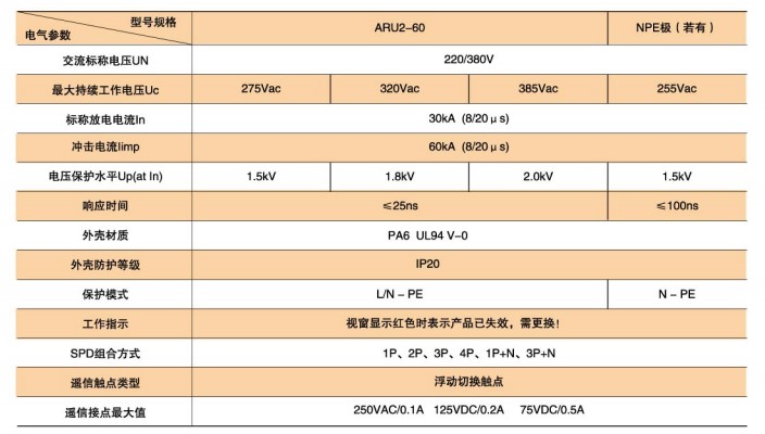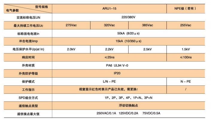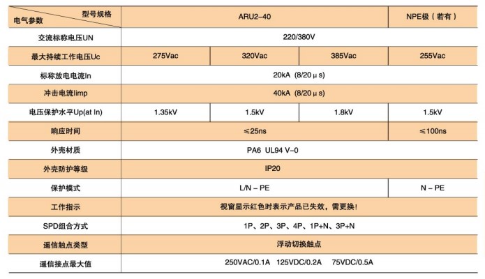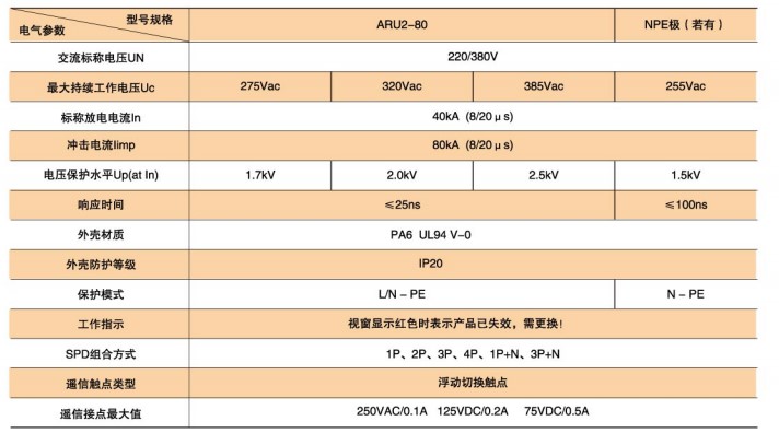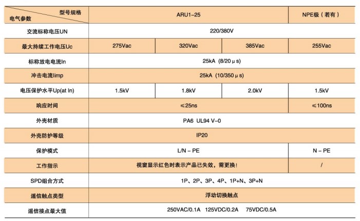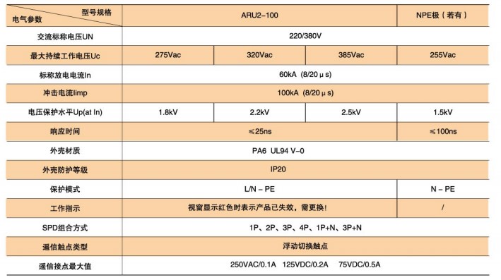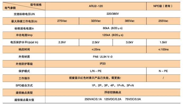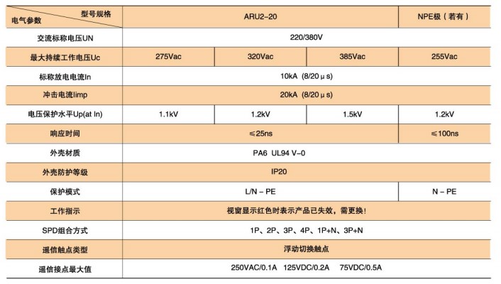 具體型號(hào): ARU2-40/385/3PARU1-25型SPD技術(shù)參數(shù)