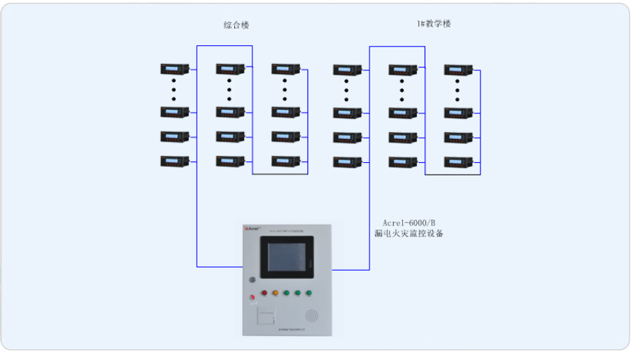 本項(xiàng)目主要是針對(duì)上海復(fù)旦高等藝術(shù)實(shí)訓(xùn)基地內(nèi)的兩棟教學(xué)樓設(shè)計(jì)電氣火災(zāi)監(jiān)控系統(tǒng)。在部分樓層配電柜的重要回路安裝安科瑞研發(fā)的ARCM系列剩余電流式電氣火災(zāi)監(jiān)控探測(cè)器,并為其配置一套Acrel-6000/B電氣火災(zāi)監(jiān)控系統(tǒng),電氣火災(zāi)監(jiān)控系統(tǒng)實(shí)時(shí)監(jiān)測(cè)重要回路的剩余電流值、箱體回路的實(shí)時(shí)溫度,監(jiān)測(cè)的數(shù)據(jù)實(shí)時(shí)傳輸至后臺(tái)主機(jī),當(dāng)發(fā)生剩余電流值越限、溫度越限時(shí),后臺(tái)能進(jìn)行聲光報(bào)警,同時(shí)后臺(tái)能夠和消防火災(zāi)報(bào)警系統(tǒng)實(shí)現(xiàn)消防聯(lián)動(dòng)。