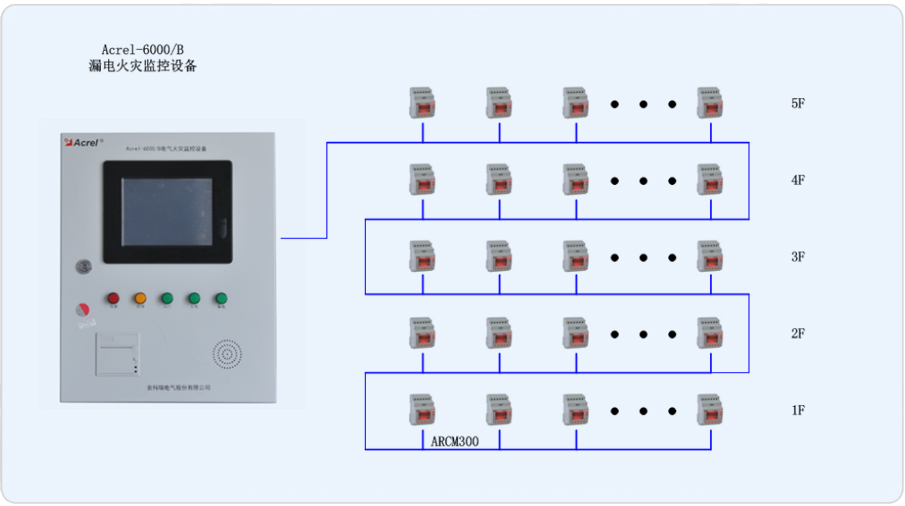 系統(tǒng)組網(wǎng)共分為站控管理層、網(wǎng)絡通訊層、現(xiàn)場設備層三層,該項目通訊總線共接入一條通訊總線,總線在樓層配電箱手拉手串接后,接入壁掛式后臺,組成電氣火災系統(tǒng)的大動脈。箱體中漏電流互感器通過電流線接入漏電探測器,漏電探測器實時顯示漏電情況,組成一套信號穩(wěn)定,精度可靠的電氣火災監(jiān)測系統(tǒng)。