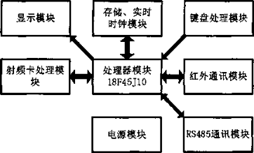 智能集中控制器包括處理器模塊、RS485通訊模塊、紅外通訊模塊、射頻卡處理模塊、存儲(chǔ)/實(shí)時(shí)時(shí)鐘模塊、顯示模塊和電源模塊等。