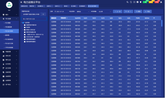 電力運(yùn)行報(bào)表顯示選定站所選定設(shè)備各回路指定采集間隔運(yùn)行參數(shù)和電能抄表的實(shí)時(shí)值及平均值行統(tǒng)計(jì)。