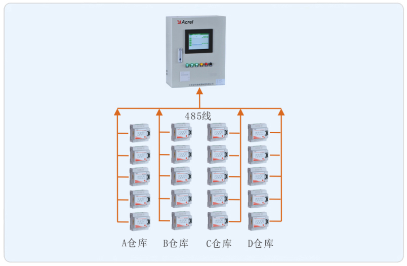 系統(tǒng)采用安科瑞消防電源監(jiān)控系統(tǒng),該系統(tǒng)主要采用分層分布式網(wǎng)絡(luò)結(jié)構(gòu),系統(tǒng)結(jié)構(gòu)為:站控管理層、網(wǎng)絡(luò)通訊層和現(xiàn)場設(shè)備層。其中廣陳第三方電子商務(wù)平臺托管產(chǎn)業(yè)基地現(xiàn)場設(shè)備分布為A、B、C、D倉庫以及綜合辦公用房消防配電回路。該系統(tǒng)監(jiān)控所有消防配電柜內(nèi)消防回路雙電源的實(shí)時運(yùn)行狀態(tài),如有異常會后臺報(bào)警。所有監(jiān)測模塊通過485總線鋪設(shè)至消防控制室,消防電源監(jiān)控主機(jī)從而完成對監(jiān)測模塊的采集并監(jiān)控。