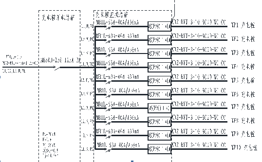 電氣防火限流式保護(hù)器在電動車充電樁的圖紙如下圖所示,一般是一個配電回路帶多個出線充電回路。每一個充電樁回路配備一只電氣防火限流式保護(hù)器。