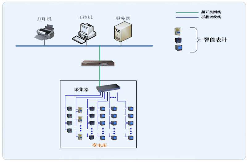 系統(tǒng)采用Acrel-2000型電能管理系統(tǒng),整個系統(tǒng)采用網(wǎng)絡(luò)分布式結(jié)構(gòu),監(jiān)控主機位于變電所內(nèi)值班室,變電所內(nèi)配置一套采集設(shè)備進行數(shù)據(jù)的采集,所有配電回路均配備智能儀表。該項目實現(xiàn)了安國酒店變電所的配電回路重要數(shù)據(jù)的實時采集,存儲,顯示。所有監(jiān)控設(shè)備均通過屏蔽雙絞線連接至采集箱的通訊采集器,再通過網(wǎng)線將數(shù)據(jù)傳輸至系統(tǒng)主機,從而實現(xiàn)電力監(jiān)控系統(tǒng)的整體搭建。