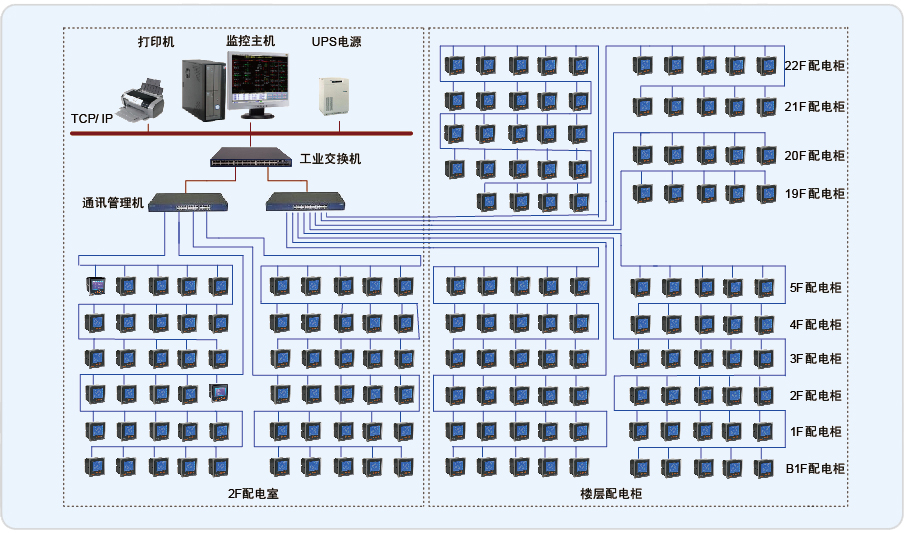 上海百樂門大酒店電力監(jiān)控系統(tǒng)監(jiān)控范圍為百樂門大酒店的22個樓層的PZ系列電力儀表和配電室的PZ、ACR系列電力儀表進行遠程監(jiān)測。現(xiàn)場設備全集中在同一個配電室中,業(yè)主的電氣值班室就近安排在配電室旁,本系統(tǒng)監(jiān)控中心也安置在該值班室中。系統(tǒng)組網采用常見的3層結構,站控管理層、通訊管理層和現(xiàn)場設備層。
