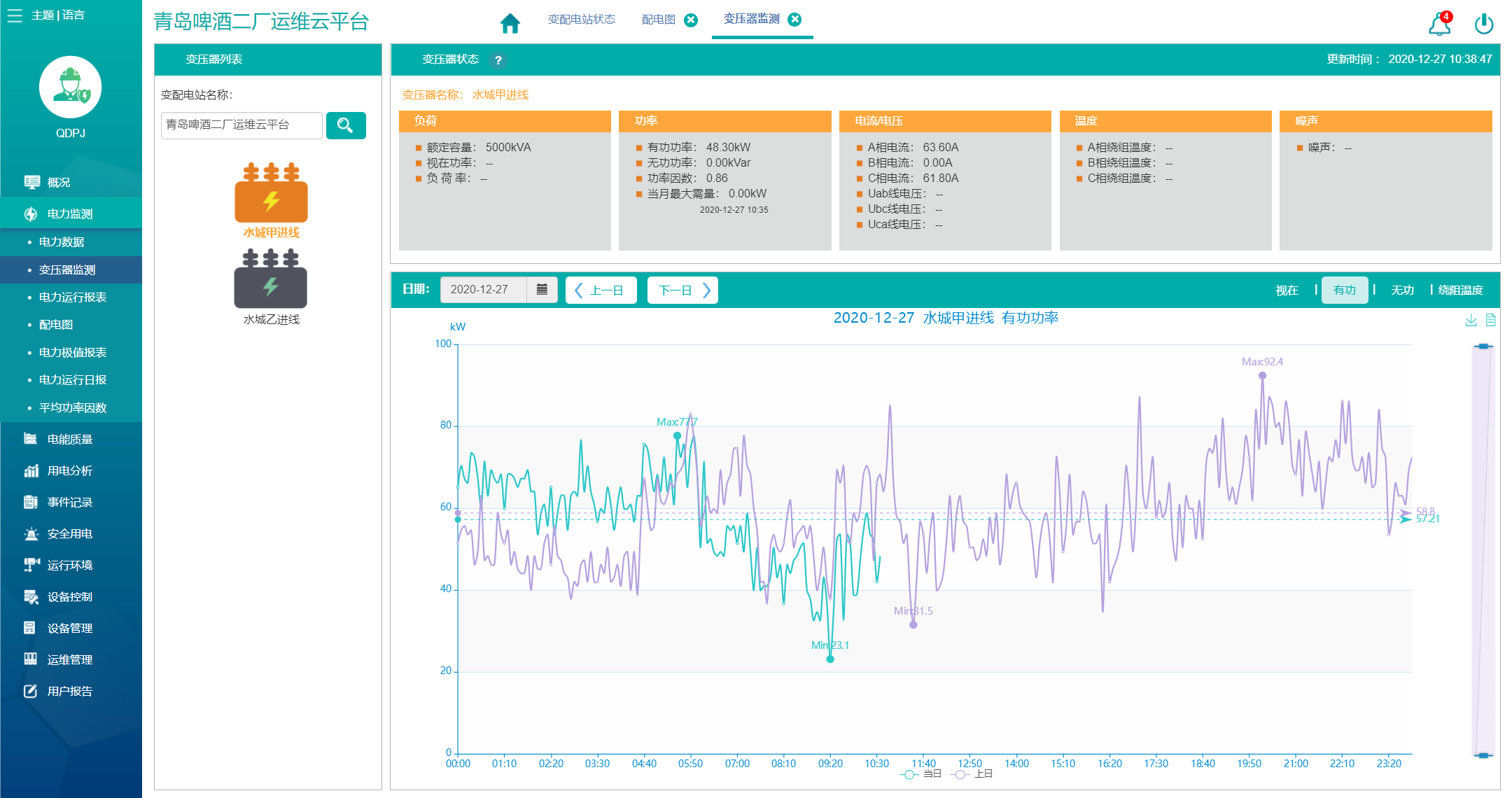 “電力監(jiān)控”頁面包括配電圖、變壓器監(jiān)測、電力數(shù)據(jù)。
