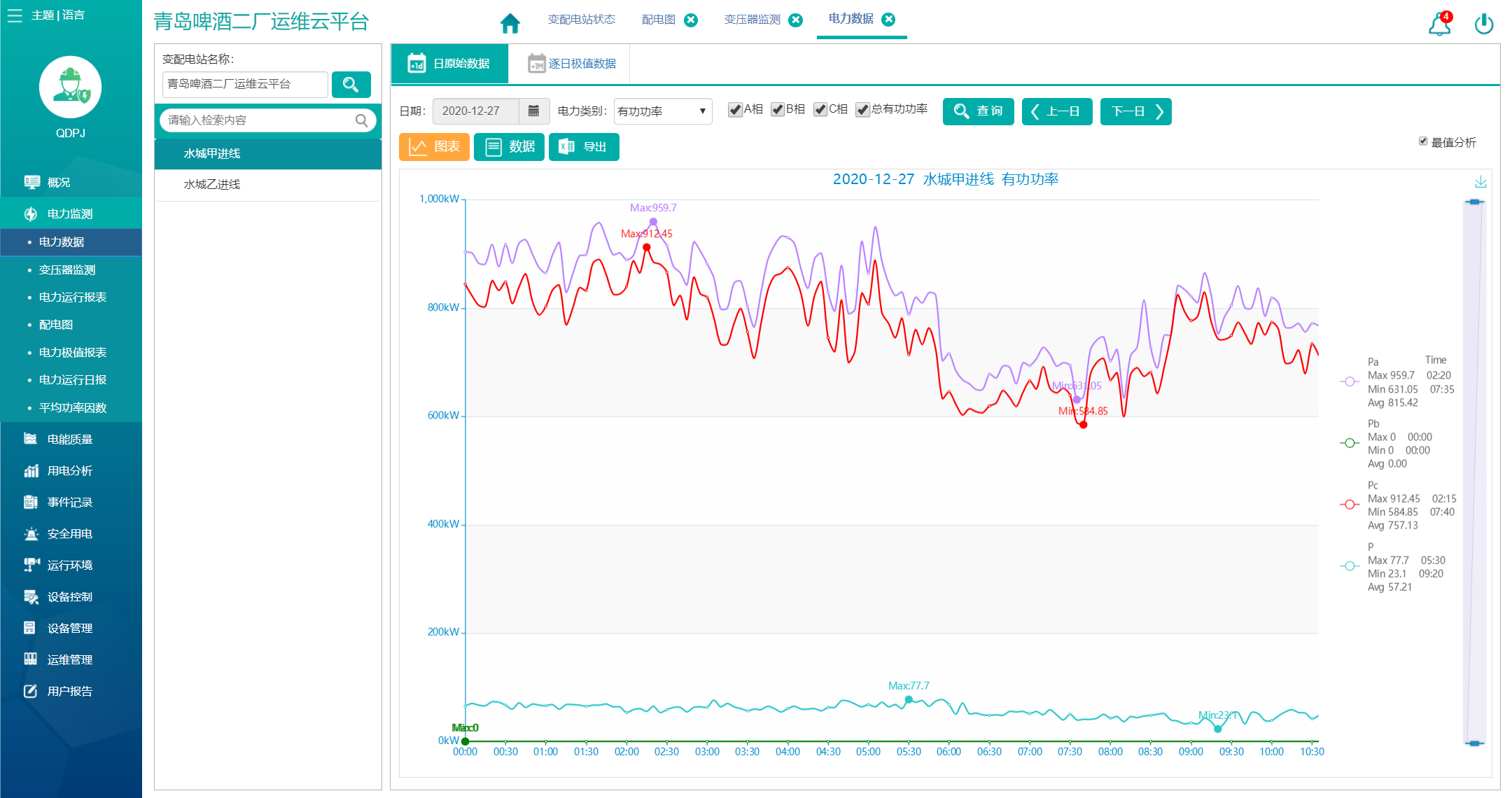 電力數(shù)據(jù)顯示變電所各回路的電力數(shù)據(jù)和曲線,包括電流、相電壓、線電壓、頻率、功率因數(shù)、有功功率、無功功率、視在功率等參數(shù),并可導出圖表。