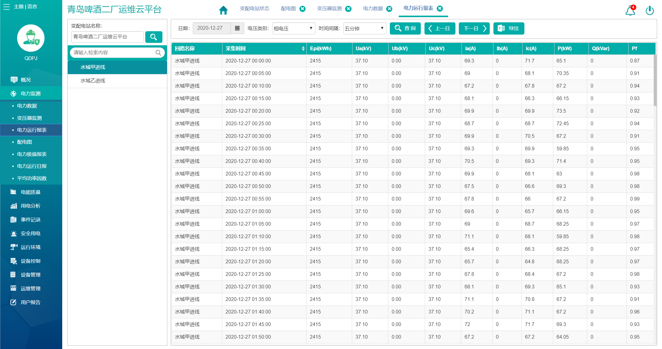 電力數(shù)據(jù)顯示變電所各回路的電力數(shù)據(jù)和曲線(xiàn),包括電流、相電壓、線(xiàn)電壓、頻率、功率因數(shù)、有功功率、無(wú)功功率、視在功率等參數(shù),并可導(dǎo)出圖表。