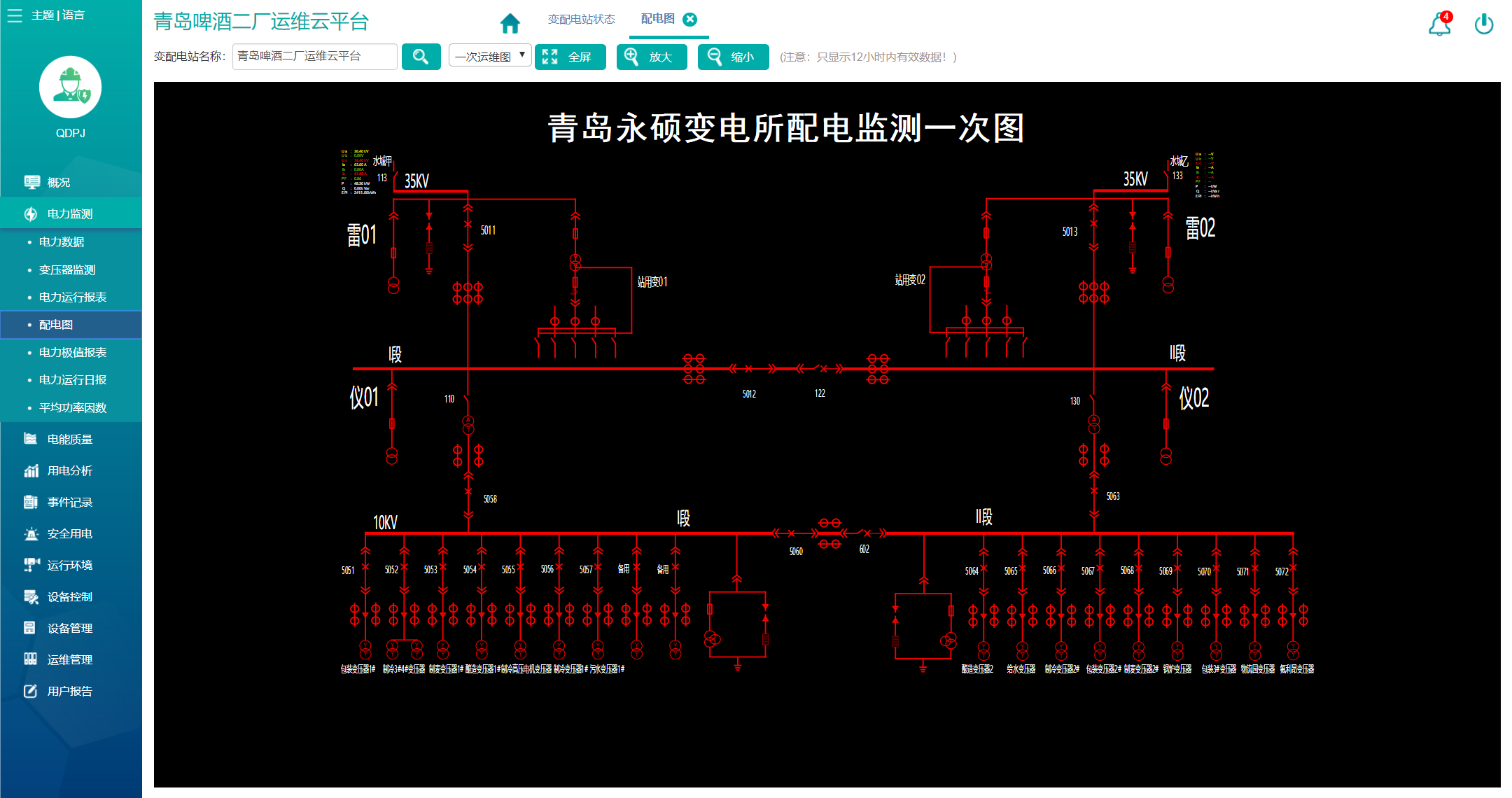 “電力監(jiān)控”頁(yè)面包括配電圖、變壓器監(jiān)測(cè)、電力數(shù)據(jù)。