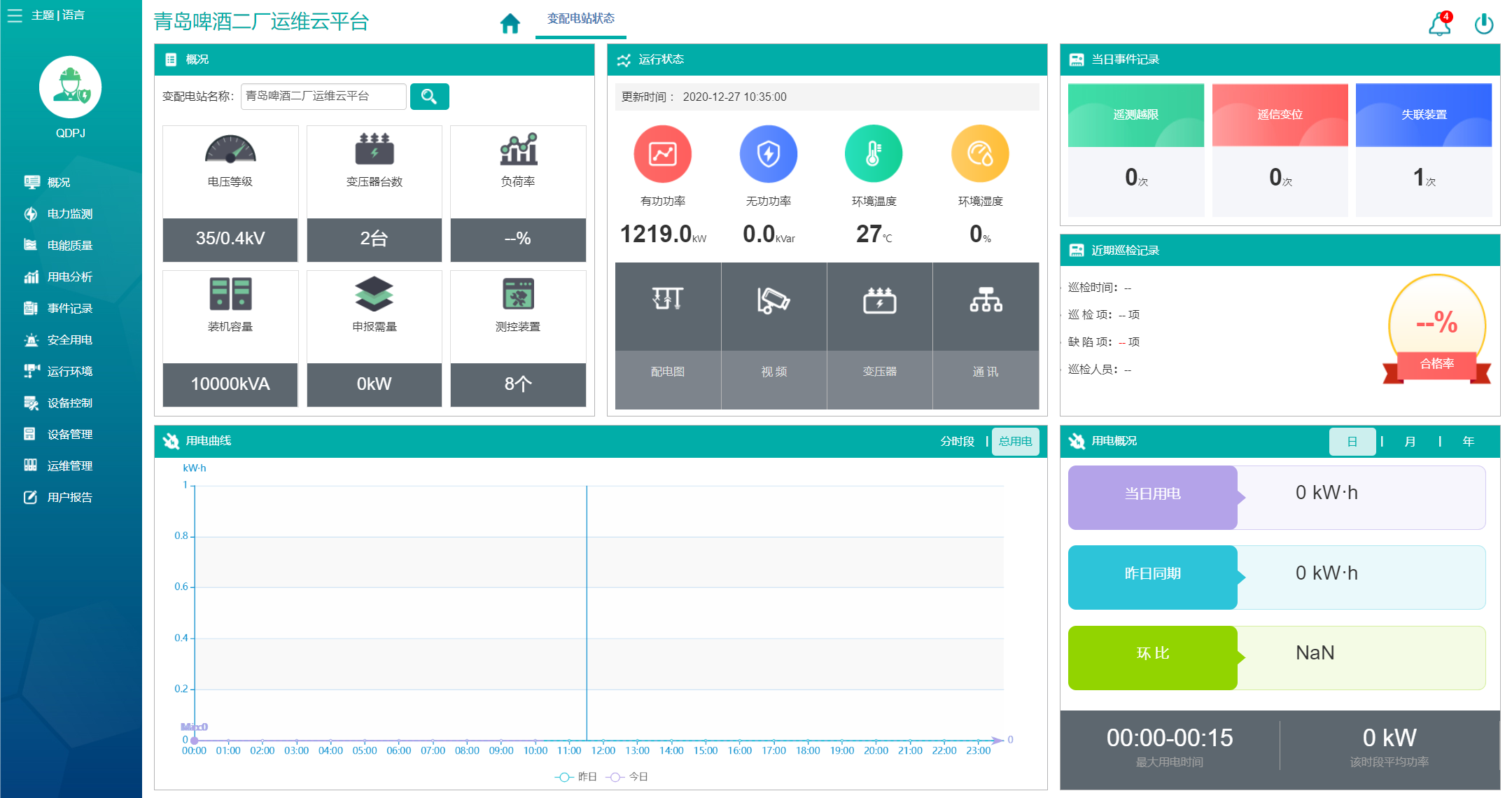 平臺(tái)首頁(yè)為變電所概況,包括變電所狀態(tài)、地圖導(dǎo)航和用能月報(bào)。變電所狀態(tài)包括:變電所概況、運(yùn)行狀態(tài)、當(dāng)日事件記錄、當(dāng)日逐時(shí)用電曲線(xiàn)、用電概況。