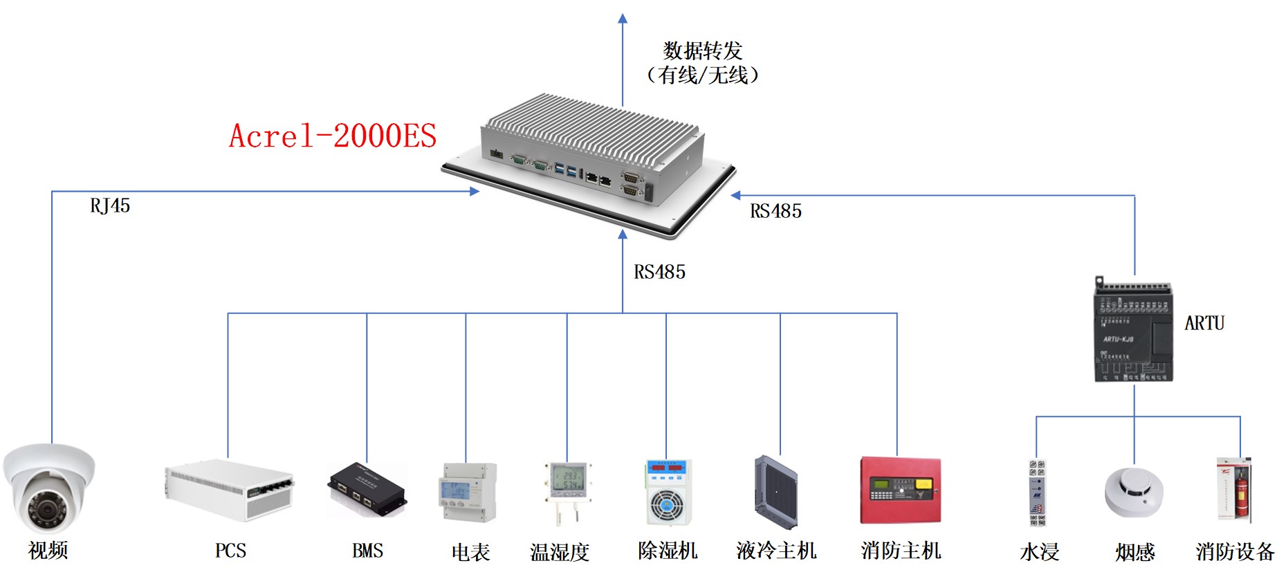 Acrel-2000ES,可通過直采或者通過通訊管理或串口服務(wù)器將儲能柜或者儲能集裝箱內(nèi)部的設(shè)備接入系統(tǒng)。系統(tǒng)結(jié)構(gòu)如下: