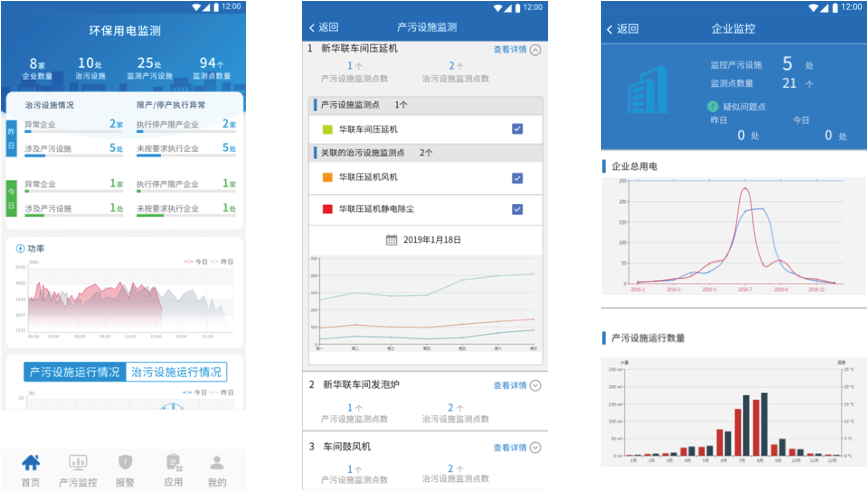 平臺(tái)首頁(yè)顯示企業(yè)概況,用電統(tǒng)計(jì),產(chǎn)污設(shè)施運(yùn)行柱狀圖,治污設(shè)施運(yùn)行柱狀圖,如圖所示: