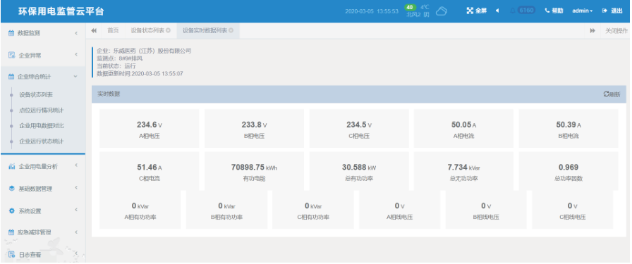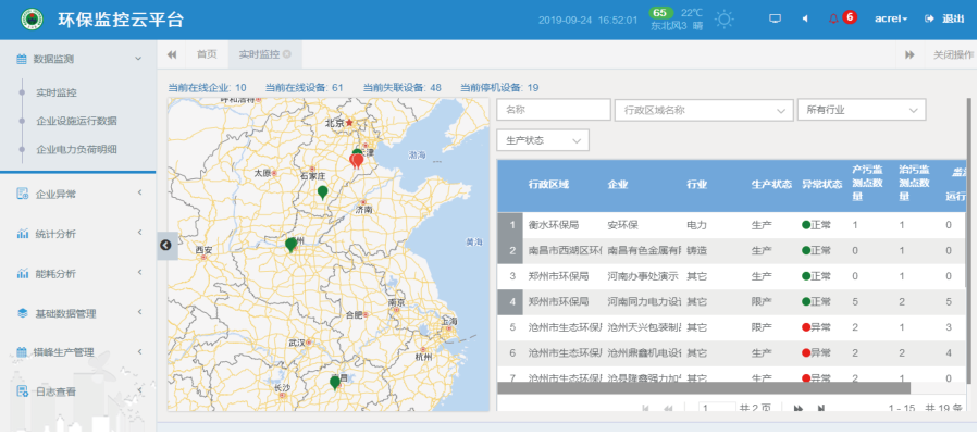 設(shè)備狀態(tài)分析:統(tǒng)計(jì)分企業(yè)某個(gè)時(shí)間段內(nèi)的產(chǎn)污設(shè)備運(yùn)行、停機(jī),監(jiān)測(cè)設(shè)備失聯(lián),可以查看實(shí)時(shí)上報(bào)的數(shù)值。