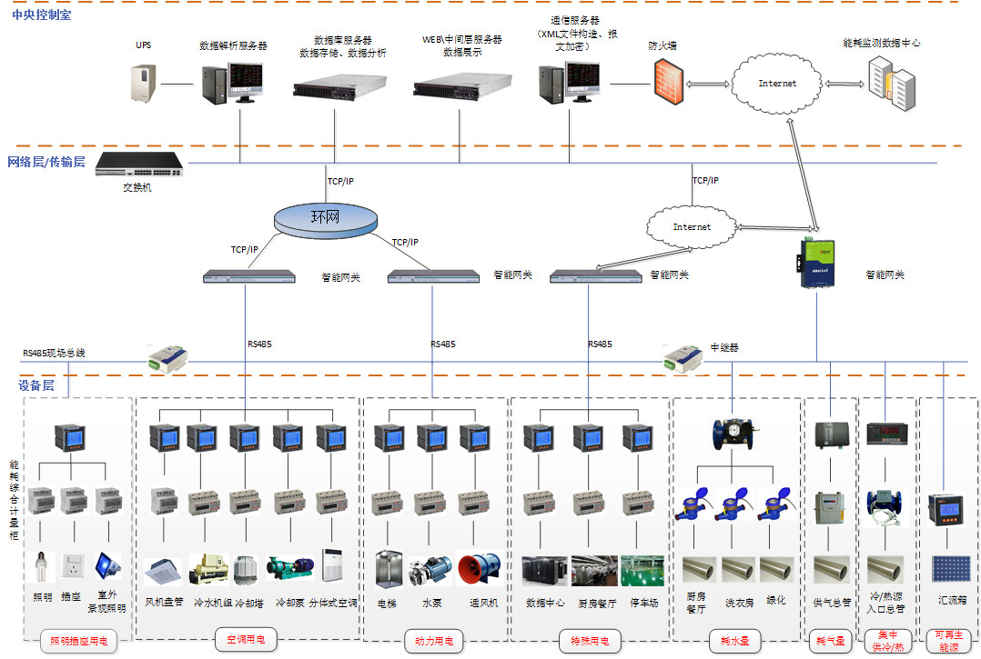 Acrel-5000建筑能耗分析管理系統(tǒng)以計算機、通訊設備、測控單元為基本工具,根據(jù)現(xiàn)場實際情況采用現(xiàn)場總線、光纖環(huán)網(wǎng)或無線通訊中的一種或多種結(jié)合的組網(wǎng)方式,為大型公共建筑的實時數(shù)據(jù)采集及遠程管理與控制提供了基礎平臺,它可以和檢測設備構成任意復雜的監(jiān)控系統(tǒng)。開放性、網(wǎng)絡化、單元化、組態(tài)化的采用面向?qū)ο蟮姆謱?、分級、分布式智能一體化結(jié)構。建立如下層次結(jié)構: