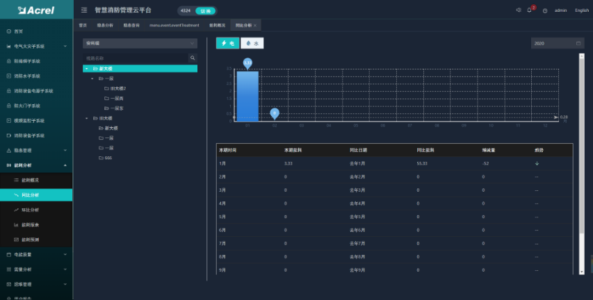 能耗分析功能包括了能耗概況、能耗同比、能耗環(huán)比、能耗報表和能耗預(yù)測等五個模塊??梢圆榭吹卿浻脩粝碌乃许椖?的能耗統(tǒng)計、同環(huán)比和報表,且按日、周、月等維度進行能耗預(yù)測分析。